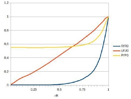 На рисунке 1 представлены результаты расчетов, масштабированные относительно значений на фронте ударной волны. Результаты расчетов хорошо согласуются с данными из классических источников [6; 7].