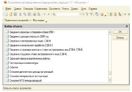 Рис. 4. Выбор объекта в «1С: Управление производственным предприятием».