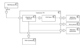 На завершающей стадии проектирования ПС выполняется разработка диаграммы компонентов. Диаграмма компонентов – статическая структурная диаграмма, показывает разбиение программной системы на структурные компоненты и связи (зависимости) между компонентами. В качестве физических компонентов могут выступать файлы, библиотеки, модули, исполняемые файлы, пакеты и т. п. Разрабатываемая ПС имеет клиент-серверную архитектуру, поэтому было необходимо организовать межкомпонентное взаимодействие как сервера с клиентом, так и программного обеспечения сервера с базовыми средствами операционной системы с помощью различных протоколов и типов связи. Запрос пользователя обрабатывается сервером и в зависимости от его типа могут быть задействованы самые разные компоненты. Так компонент PHP Word выполняет формирование документов по заранее созданным шаблонам для отчетности, а база данных и файловое хранилище предоставляют необходимые данные, будь то изображения, документы или иная информация. Созданная структура взаимосвязи компонентов представлена на рисунке 3.