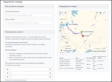 Каждый пользователь может предложить поездку. На странице создания поездки пользователю предлагается ввести пункт выезда и пункт приезда, а также добавить промежуточные пункты. Автоматически рассчитывается стоимость поездки и время прибытия. При вводе пользователем данных выезда, приезда и промежуточных пунктов автоматически не только подсказываются города и места, но и строится карта с полной информацией о предстоящей поездке (рис. 6).