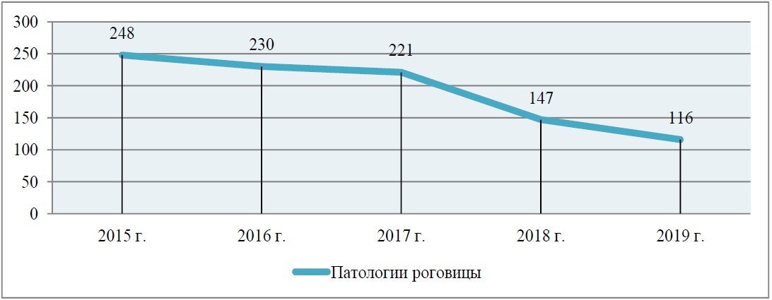 Нами была выявлена тенденция к снижению роговичной патологии за исследуемый период (2015 г. – 248 случаев, 2016 г. – 230 случаев, 2017 г. – 221 случай, 2018 г. – 147 случаев, 2019 г. – 116 случаев (рис. 2). Можно предположить, что это связано с редкой обращаемостью пациентов (многие предпочитают заниматься самолечением) и снижением количества вредоносных производственных условий труда.