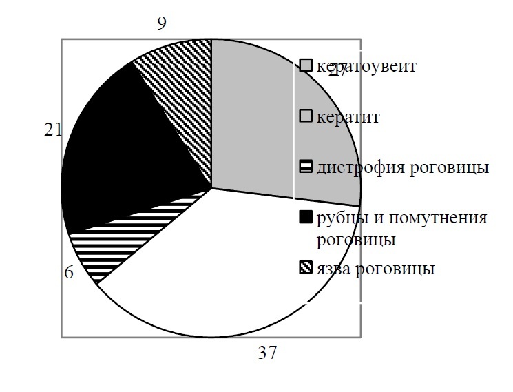 В Российской Федерации частота офтальмопатологии составляет около 11 тысяч человек на 100 тысяч населения. Заболевания роговицы составляют ¼ – ⅕ часть от всей глазной патологии. У 25–75% больных возникают неблагоприятные последствия, что приводит к образованию разной степени бельм со снижением, а иногда и полной потерей зрения. Слепота является одной из важнейших социальных проблем. Потеря зрения по причине роговичной патологии в настоящее время является обратимой [5; 6]. В связи с этим нами было проведено исследование, направленное на изучение структуры заболеваемости кератопатологией в регионе.