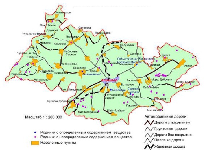 Так, родники показаны точечными символами размером 8 пунктов, но разного цвета: синего – для родников с лабораторно определенными показателями качества воды, фиолетового – с неопределенными значениями содержания веществ. Подписи названий родников даны шрифтом Arial обычный курсивного начертания синего цвета, размер 11 пунктов. Проанализированные показатели качества воды – число значения в единицах измерения: общей жесткости – начертание обычное, размеры 10 пунктов, темно-зеленый цвет (для нормы) и 12 пунктов, красный цвет (для превышения нормы); водородного показателя (pH) – размер 14 пунктов, темно-зеленый цвет (норма). Контуры населенных пунктов представлены полигонами оранжевого цвета с обводкой черного цвета без подразделения на жилые кварталы, особо выделен центр района – р.п. Атяшево – сиреневым цветом с обводкой черного цвета. Подписи населенных пунктов даны шрифтом Arial обычный, черного цвета, размером 10 пунктов; для р.п. Атяшево подпись выполнена полужирным курсивом шрифтом Arial красного цвета, размер 12 пунктов. Пути сообщения (автомобильные и железные дороги) показаны линиями различной толщины (от 1,5 до 3 пунктов) и внутреннего рисунка – в зависимости от их значимости; транспортная сеть указана для ориентирования на территории района, а также планирования и реализации мероприятий по отбору проб воды, благоустройству и мониторингу состояния источников и качества воды в них.