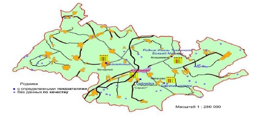 Рис. 1. Особенности пространственного размещения родников на территории Республики Мордовия (выделена территория Атяшевского района)