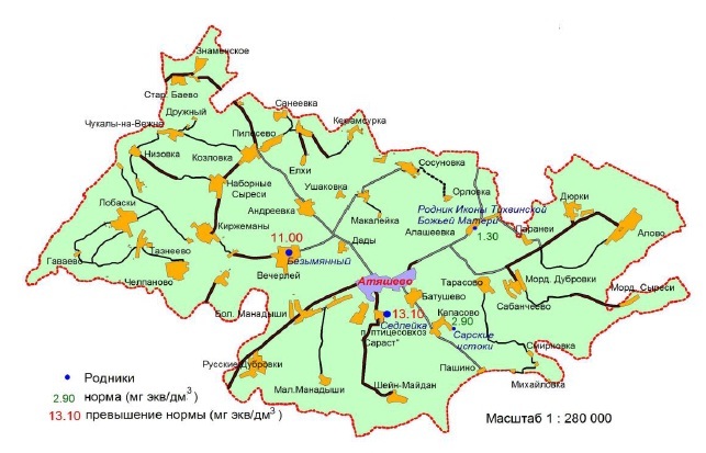 Рис. 4. Родники Атяшевского района с данными по содержанию контролируемых веществ