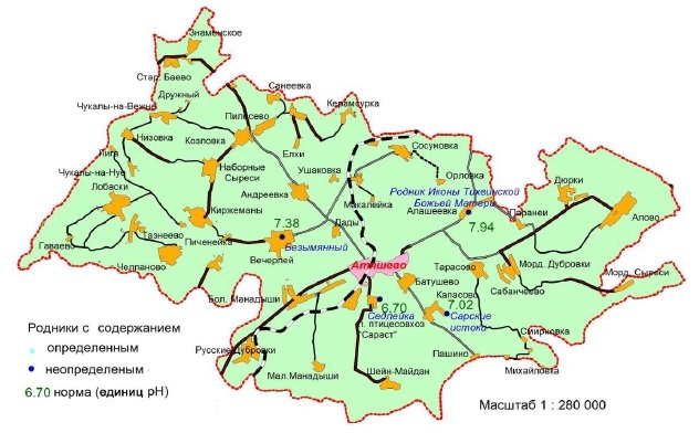 Рис. 6. Родники Атяшевского района с данными по значению водородного показателя (2012 г.)