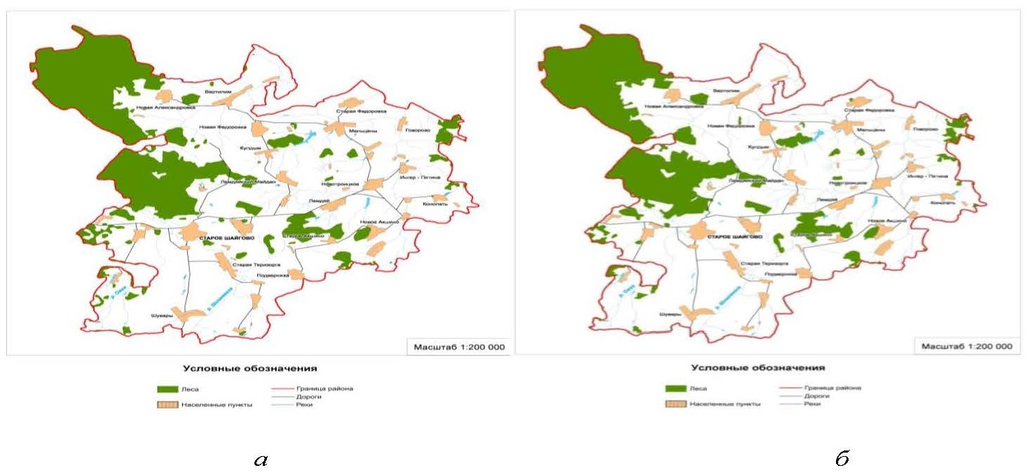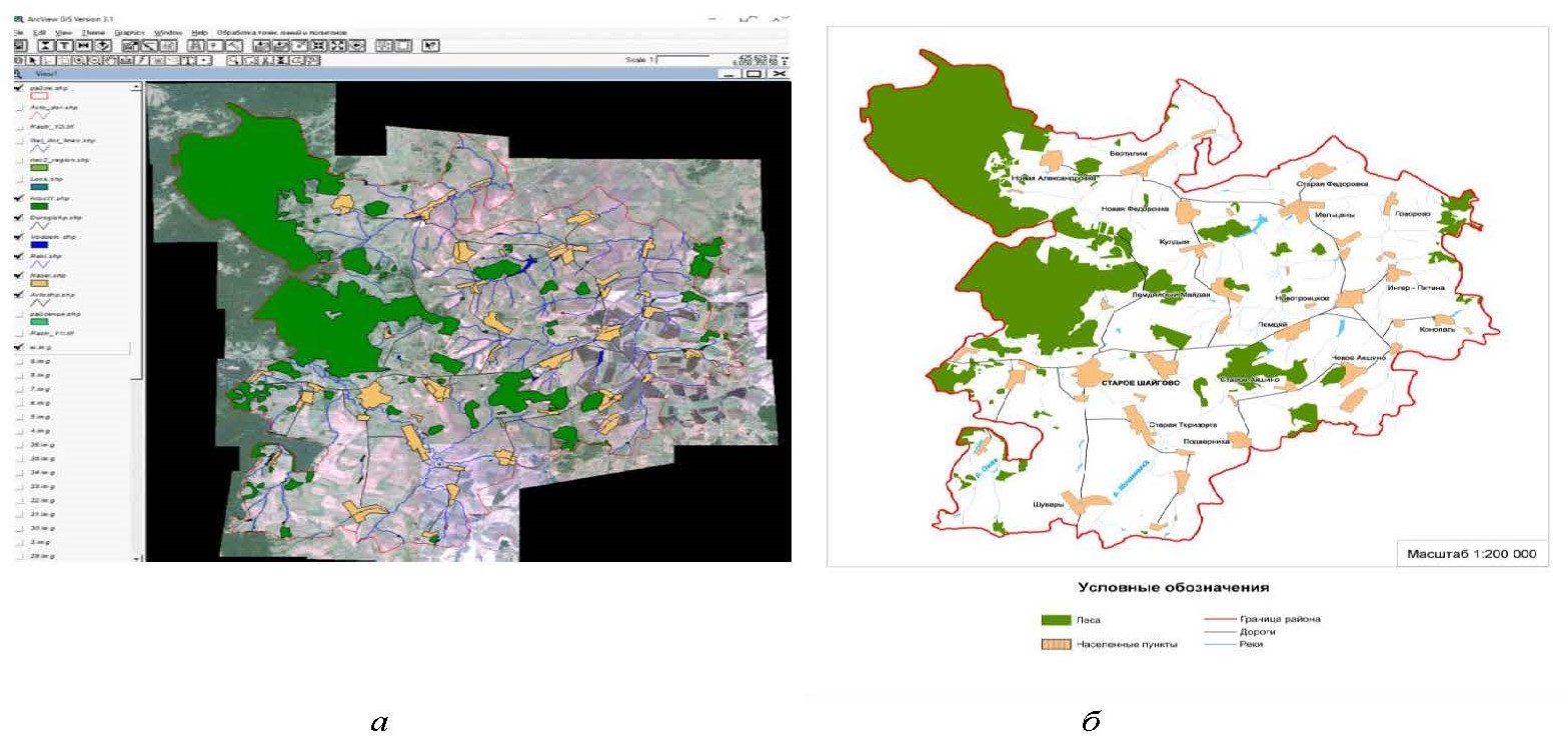 Затем в программе ERDAS Imagine создалась мозаика снимков, и в итоге был получен единый файл на все территорию Старошайговского района. После подгрузки данной мозаики в ГИС ArcView осуществлялось визуальное дешифрирование лесных массивов территории с последующей оцифровкой (см. рис. 2, а). Из готового набора пространственных данных на территорию Республики Мордовия были добавлены следующие слои: административное деление, гидрографическая сеть, населенные пункты, автомобильные дороги [4]. В результате проделанной работы получена карта распространения лесов на 2016 г. (см. рис. 2, б).