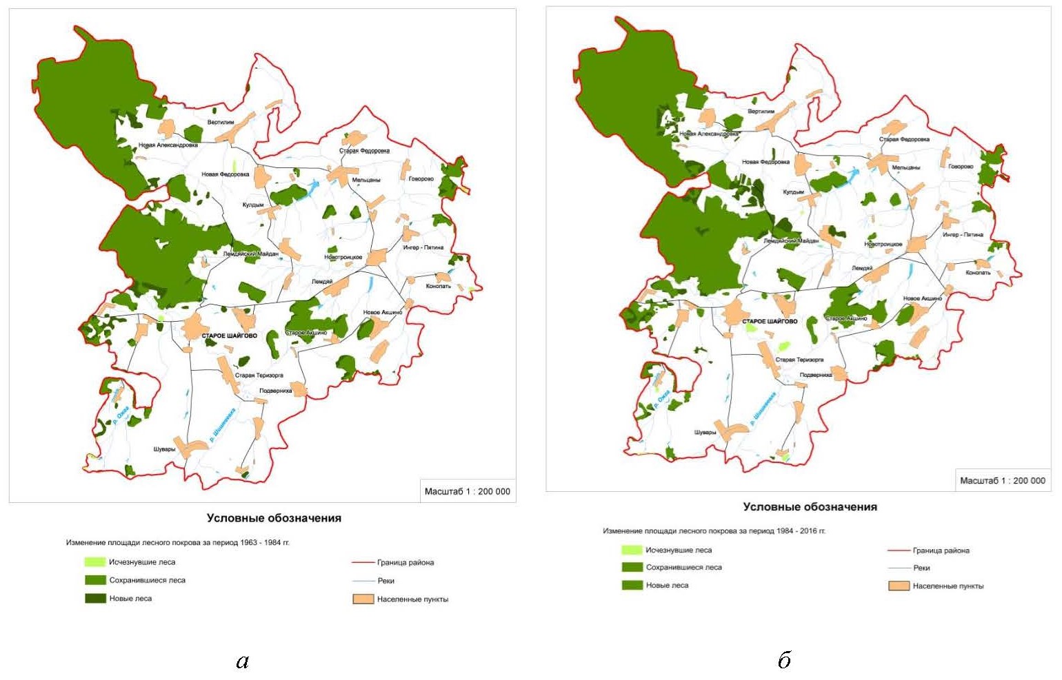 Далее были проанализированы и сравнены полученные карты, а также созданы карты изменения площади лесов за два временных периода: 1963–1984 гг. (см. рис. 5, а), 1984–2016 гг. (см. рис. 5, б). На картах все леса разделены на три группы: исчезнувшие, сохранившиеся, новые (см. рис. 5).