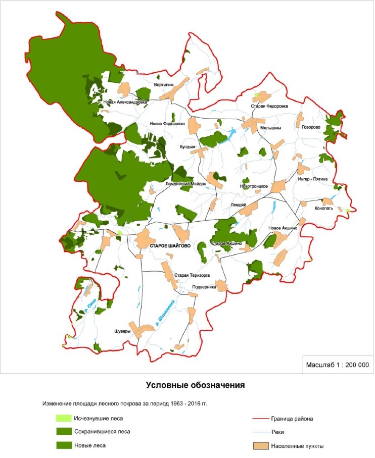 Рис. 6. Изменение площади лесов Старошайговского района Республики Мордовия за период 1963–2016 гг. (исходный масштаб 1 : 200 000)
