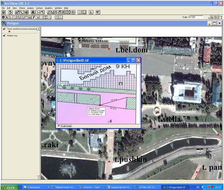 Координаты полигона были определены в процессе постобработки и уравнивания полученных измерений в программе TopconTools v.8.2.3. Для процесса уравнивания статики необходимо ввести координаты хотя бы одного известного пункта, которые являются предопределенными, а также занести данные по высоте антенны и методу ее измерения. После назначения точных координат известному пункту его необходимо сделать контрольным в плане и по высоте, чтобы вычисляемое положение остальных пунктов сеанса наблюдений рассчитывалось относительного его фиксированного положения. Для наглядности размещения геодезических пунктов полигона был создан проект в ГИС ArcView v.3.2 [2]. Используя инструментарий ГИС, мы привязали космический снимок высокого пространственного разрешения на территорию учебного полигона и далее используя инструментарий ГИС (подключение по «горячей связи») к его пунктам привязали следующую информацию – абрис геодезического пункта, а также координаты и высотную отметку (см. рис. 1).