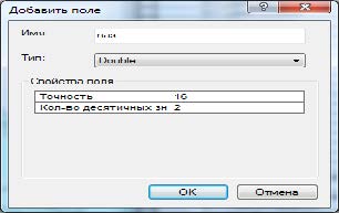 - Создание дополнительных полей «nas» (численность населения) «MR» (муниципальный район) для полигонального слоя «towns», выполненное в приложении ArcMap ГИС ArcGIS. Для этого в открытой атрибутивной таблице слоя выполнена команда «Опции таблицы / Добавить поле». В появившемся окне задавалось имя нового поля и выбирался его тип «double» (формат: число с плавающей запятой), а в свойствах поля указывались точность и количество десятичных знаков (см. рис. 1).