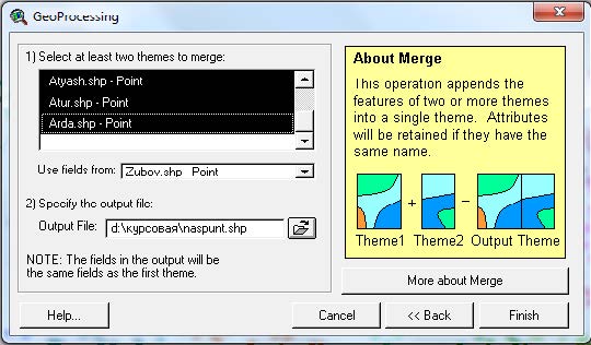 - Объединение слоев населенных пунктов, подразделенных по территориальному признаку, в единый слой для всей республики («atribut»), выполненное в ГИС ArcView. Работа по слиянию слоев также выполнялась с использованием мастера пространственных операций модуля «Geoprocessing», после запуска которого выбирался второй пункт меню («Merge themes together»).