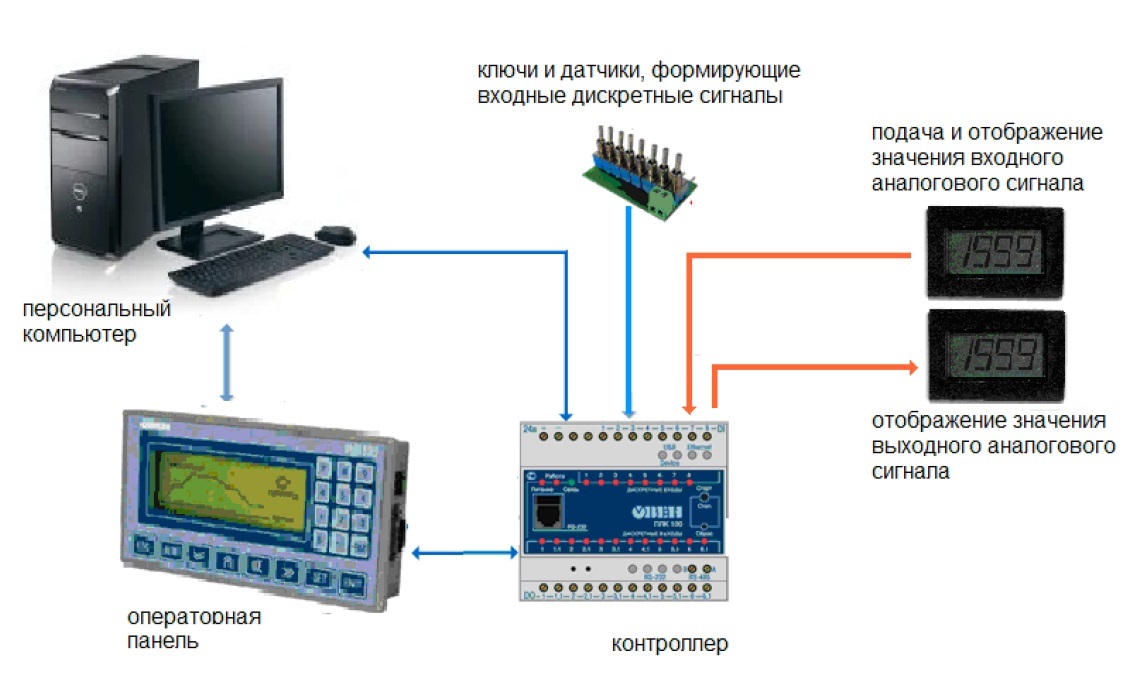 Рис. 1. Структура учебного стенда, включающая ПЛК и компоненты, формирующие и отображающие дискретные и аналоговые входные/выходные сигналы