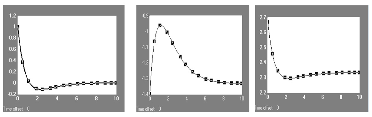 Моделирование осуществляется на основе системы (11). На рисунке 1 показана модель, выполненная в пакете Simulink. Результаты моделирования показаны на рисунке 2.