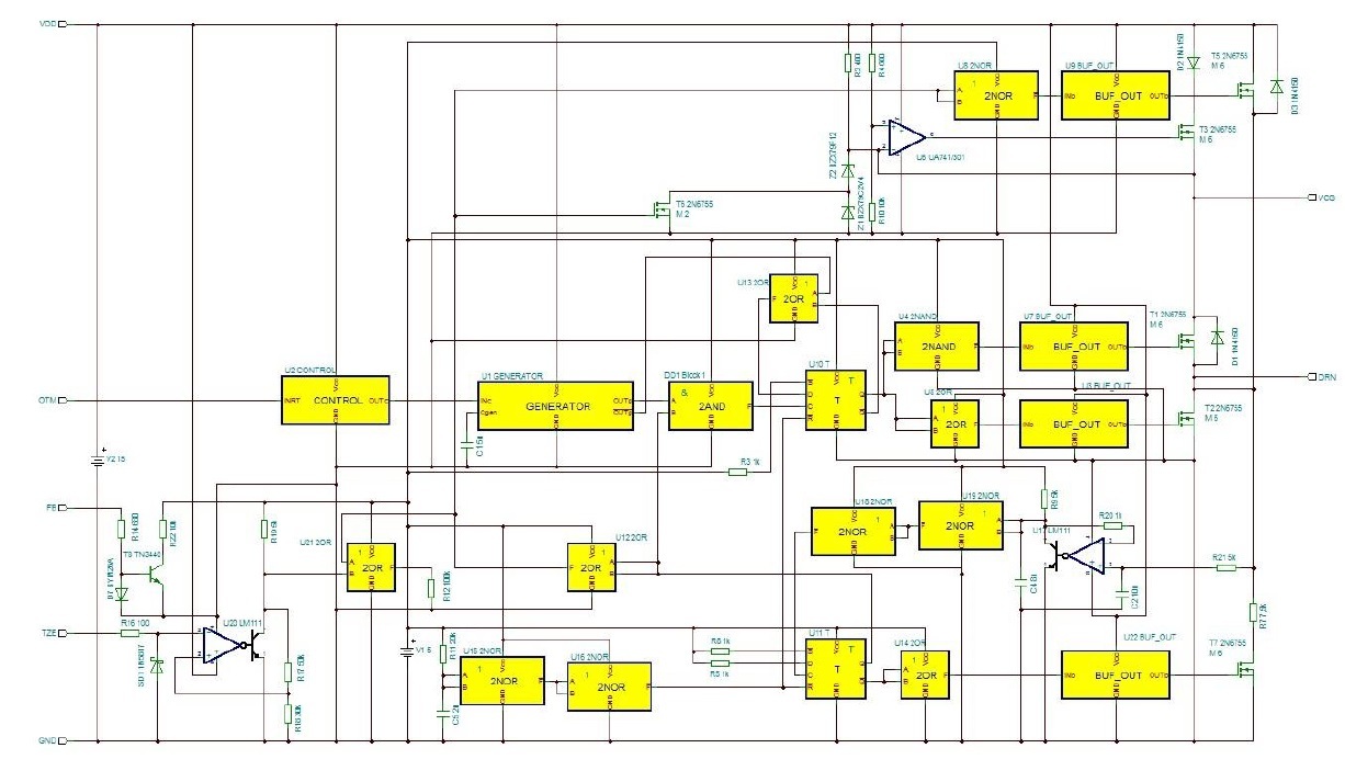 Таким образом, для реализации компьютерного моделирования была выполнена разработка SPICE-макромодели микросхемы TPS92210 для применения в составе САПР TINA-TI [4]. Применение указанной САПР связано тем, что это свободно распространяемая некоммерческая САПР с хорошо отлаженными вычислительными алгоритмами для импульсных устройств. Разработка SPICE-макромодели микросхемы TPS92210 выполнена на основе блочно-иерархического принципа. Структурная схема разработанной SPICE-макромодели (2-й уровень иерархии) микросхемы TPS92020 приведена на рисунке 2.