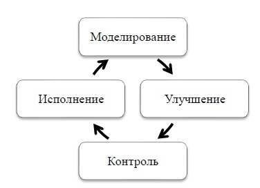 ELMA BPM – наиболее популярная BPM-система в России. В течение 10 лет этот программный инструмент позволил измениться более 1000 компаний из различных отраслей: банковская сфера, ИТ-компании, ритейлинг, ЖКХ и многие другие. ELMA BPM – отечественное ПО, направленное на развитие процессного подхода, согласно которому стратегические цели и задачи организации осуществляются на основе моделирования, выполнения, контроля и непрерывной модернизации исполняемых процессов. На рисунке 1 изображена схема работы организации, работающей на процессном подходе, при использовании ELMA BPM. Нотация, используемая в исследуемом ПО – BPMN.