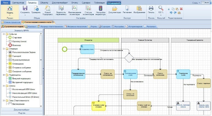 На рисунке 2 изображена рабочая область графического редактора ELMA BPM. Преимуществами ELMA BPM являются скорость внесения изменений, доступность для бизнес-пользователя, мгновенный мониторинг результата, простота работы в системе, легкость интеграции. Недостатками исследуемого ПО, отмечаемыми пользователями системы, являются неполная поддержка нотации BPMN, что влечет затруднения автоматизации бизнес-процессов.