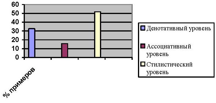 Таким образом, можно заключить, что национальные образы в англоязычном песенном дискурсе формируются на различных языковых уровнях анализируемого текста: денотативном, ассоциативном, стилистическом. Однако рисунок 1 показывает, что, хотя денотативный и ассоциативный уровни обладают меньшим количеством средств формирования национальных образов по сравнению со стилистическим уровнем, они, тем не менее, являются довольно продуктивными и в сумме дают почти половину проанализированных примеров.