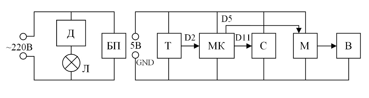 Функциональная схема макета САУ температурой в помещении представлена на рисунке 1. Конструктивно макет представляет собой замкнутый объем, в котором размещены все компоненты системы. Источником тепла внутри макета является миниатюрная лампа накаливания Л, питаемая от сети переменного тока напряжением 220 В [1]. Для плавного регулирования яркости лампы используется диммер Д, способный управлять нагрузкой до 100 Вт [2]. Блок питания БП преобразует переменное напряжение 220 В в постоянное величиной 5В, которое питает микроконтроллер МК, датчик температуры Т, MOSFET-модуль М и исполнительные механизмы системы: вентилятор В и сервопривод заслонки С.