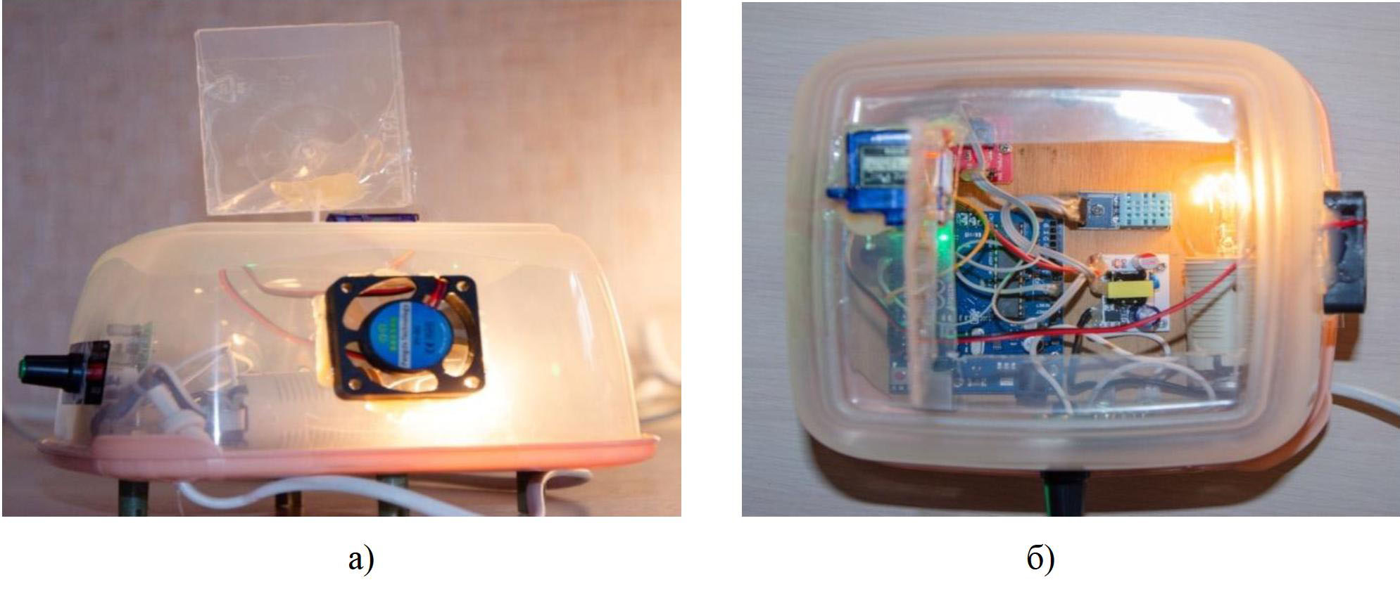 Рис. 2. Внешний вид макета САУ температурой: а) вид спереди; б) вид сверху.
