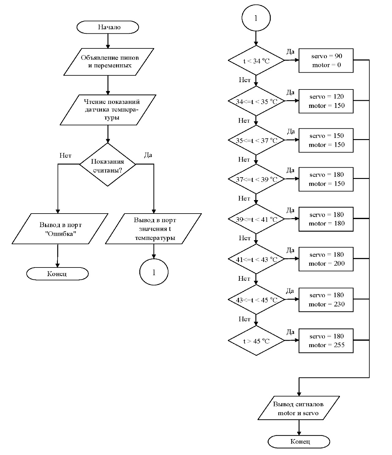 Датчик температуры опрашивается микроконтроллером каждые 2 секунды, и передаёт на цифровой вход D2 код со значением температуры. Если этого не происходит, в последовательный порт выводится сообщение об отсутствии сигнала от датчика температуры. Если же сигнал принят, то в порт выводится значение температуры t. Далее, микроконтроллер сравнивает это значение температуры с заданными диапазонами. Если значение попадает в определённый диапазон, то, согласно условию, два выходных параметра, а именно, положение вала сервопривода servo и скважность ШИМ-сигнала для вентилятора motor примут соответствующие заданные значения. Эти параметры и определят режим работы и выбор вышеназванных исполнительных механизмов (сервопривода и вентилятора) на практике.