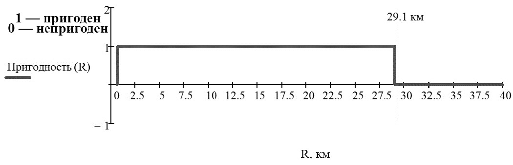 Рис. 2. Зависимость пригодности трассы от расстояния с отметкой максимальной дальности связи.
