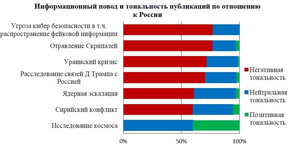 Необходимо подчеркнуть, что по меньшей мере 60% статей каждой отдельно взятой политической темы, освещаемой британскими СМИ, являются негативными, что указывает на высокую степень напряженности информационной обстановки по отношению к России в настоящее время (см. рис. 1).