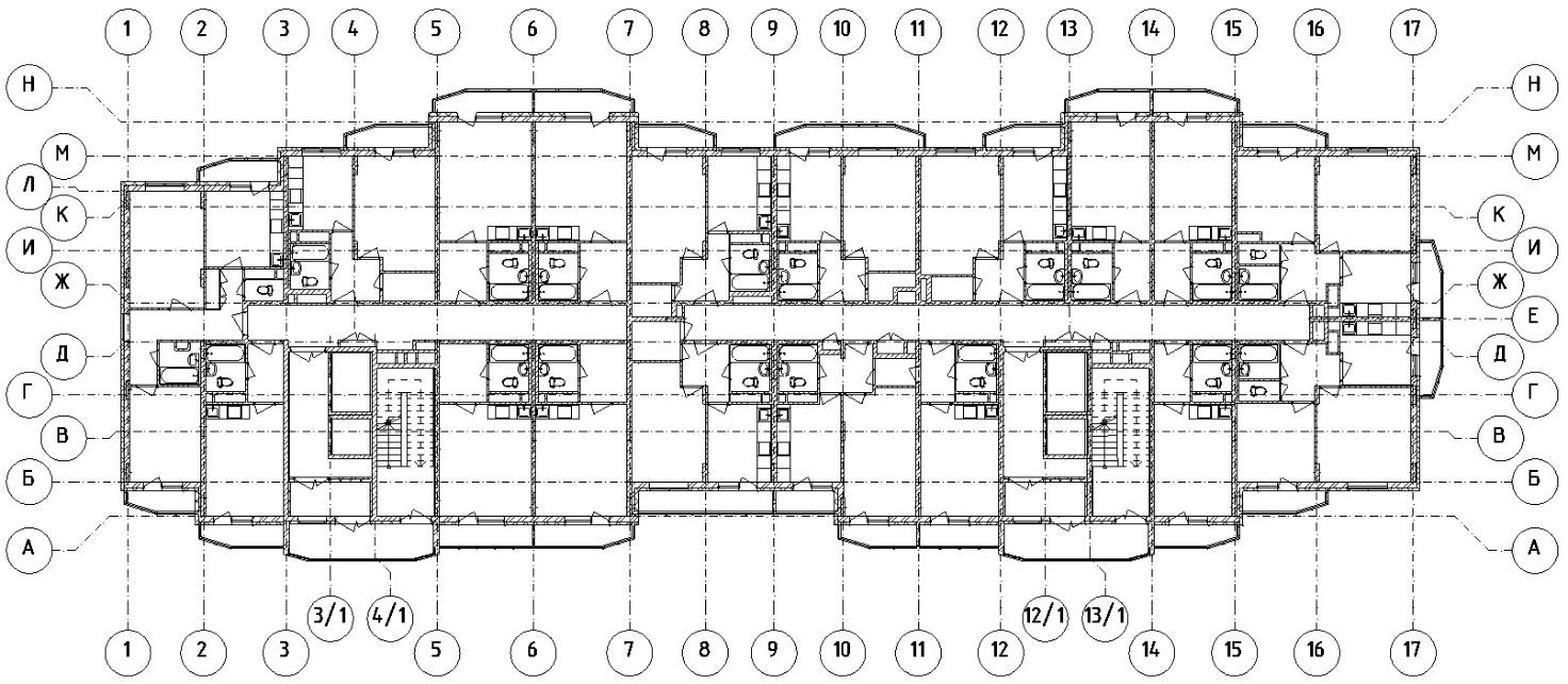 Проектируемым объектом является многоквартирный семнадцатиэтажный жилой дом двухсекционного типа со встроенными нежилыми помещениями на первом этаже для общественного пользования. Жилые этажи, начиная с третьего, имеют типовую планировку, что позволит ускорить разработку чертежей для проекта (рис. 1). Входные группы каждой секции включают тамбур, вестибюль, колясочную, помещение для консьержа. Для сообщения между входными группами и жилыми этажами дома запроектированы группы лифтов, составляющих совместно с лестничными клетками лестнично-лифтовые узлы. Высота жилых этажей составляет 2,8 м, а общественного – 3,5 м. Принятые в проекте планировки и площади квартир определены на основании исследования потребительского спроса на доступное жильё и представлены тремя основными типами квартир эконом-класса: однокомнатные студии, однокомнатные и двухкомнатные. Количество квартир каждого вида на типовом этаже – 9, 6 и 3 соответственно.