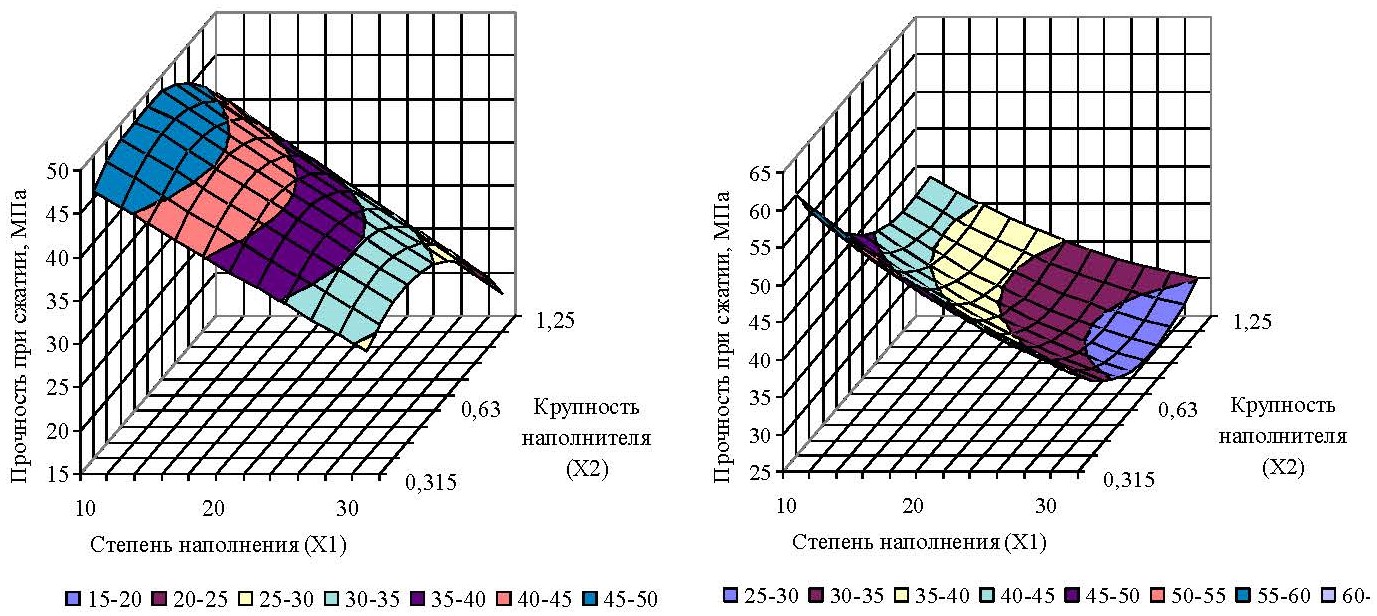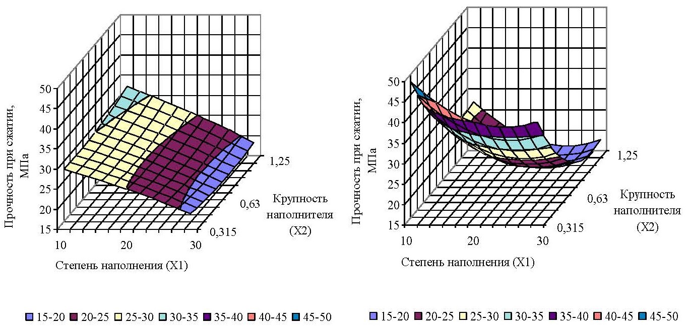 Для исследования свойств композитов был проведен двухфакторный план эксперимента, анализ результатов которого показал, что степень и крупность наполнителя с учетом концентрации пропитывающего раствора оказывают большое влияние на свойства цементного камня (рис. 1, 2).
