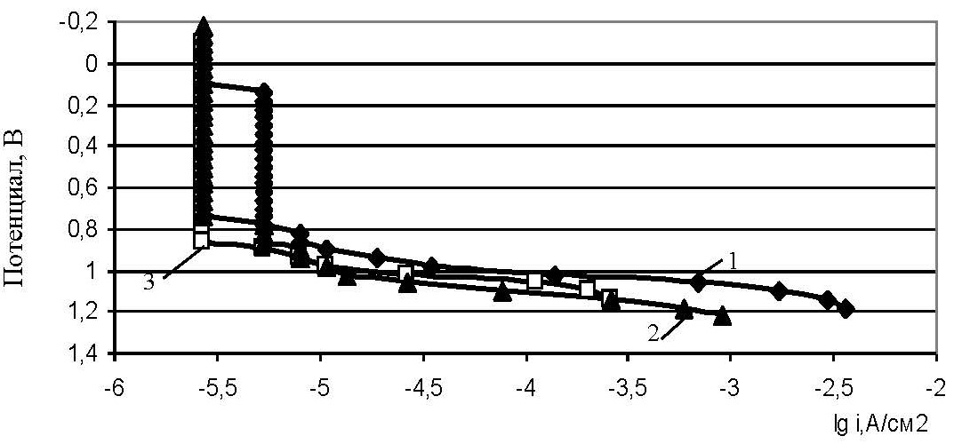 Рис. 3. Анодные поляризационные кривые стали–85 в фильтрате после выдерживания в растворе NaF с концентрацией 0,1 мг/мл цементных композитов, содержащих ЦСП в качестве наполнителя: 1 – 10%; 2 – 20%; 3 – 30%.