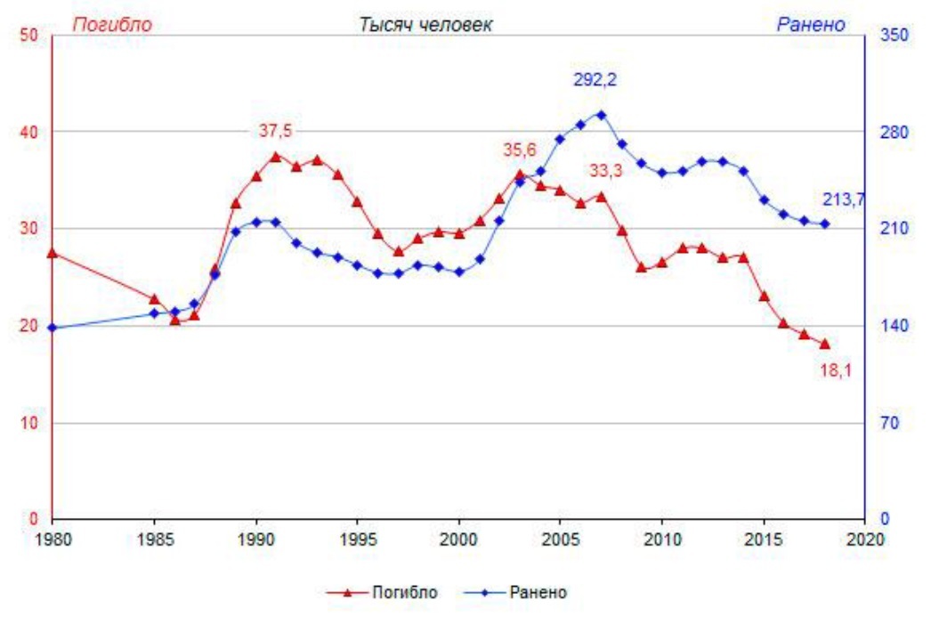 Резкий рост числа погибших и раненных в ДТП приходится на 1990-е г., когда на дорогах России погибли 37,5 тыс. чел. В последующее десятилетие эта цифра снижалась, но была все равно выше показателей последних лет существования СССР. У данной тенденции были две причины. Первое постсоветское десятилетие было достаточно кризисным, и далеко не все могли себе позволить приобретение и содержание автомобиля, но в тоже время на российский автомобильный рынок хлынули различные зарубежные автомобильные марки и определенные слои населения могли себе позволить такую покупку. Не стоит забывать, что к жертвам ДТП относятся не только водители и пассажиры, а также пешеходы. К началу 2000-х гг. число погибших и раненных в ДТП снижается, постепенно рост отмечается к 2005 г. Причины такого роста выявить довольно сложно. Возможно, это связано с перенасыщенностью автомобильного рынка и халатностью отношения человека к собственной жизни и жизни других.