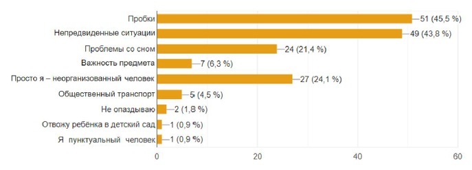 Ответы на третий вопрос анкеты «Каковы, на Ваш взгляд, основные причины опозданий?» (максимум два варианта) имеют следующий вид: наиболее популярная причина опозданий – «пробки»; на втором месте «непредвиденные ситуации, чрезвычайные обстоятельства»; далее идет вариант ответа «просто я – неорганизованный человек»; следующей по популярности причиной опоздания являются «проблемы со сном»; далее – «опоздания зависят от важности предмета»; 6 место занимают «проблемы с общественным транспортом». Также респонденты, помимо предложенных ответов, представили свои варианты: «не опаздываю», «отвожу ребенка в детский сад» и «я – пунктуальный человек» (см. рис. 4).
