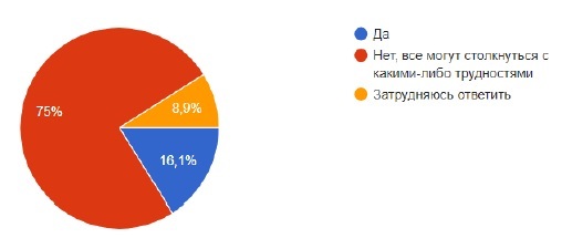Ответы на четвертый вопрос анкеты «Считаете ли Вы опоздание проявлением неуважения к преподавателю/студентам?» распределились следующим образом: «нет, все могут столкнуться с какими-либо трудностями» – 84 человека (75 %); «да» – 18 человек (16,1%); «затрудняюсь ответить» – 10 человек (8,9 %). Из этого следует, что не все студенты уважают академическую этику, способствующую поддержанию делового общения и формированию корпоративной культуры на стадии обучения (см. рис. 5).