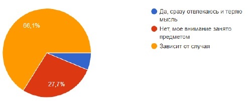 На шестой вопрос анкеты «Отвлекаетесь ли Вы, когда опаздывающий входит в аудиторию?» большинство респондентов ответили «зависит от случая» – 74 человека (66 %). Второй по популярности ответ «нет, мое внимание занято предметом» – 31 человек (27,7 %) и ответ «да, сразу отвлекаюсь и теряю мысль» выбрали 7 человек (6,3 %). То есть внимание студентов во время занятия сосредоточено на дисциплине, что можно считать заслугой преподавателя, но оно все равно переключается на опоздавшего (см. рис. 7).