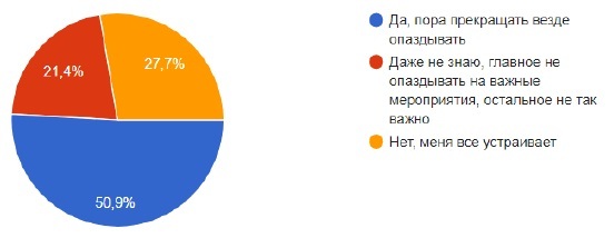 На заключительный вопрос анкеты «Хотели бы Вы изменить ситуацию, поработать над своей пунктуальностью?» многие ответили «да, пора прекращать везде опаздывать» – 57 человек (50,9 %). 31 человек (27,7 %) выбрали ответ «нет, меня все устраивает», вариант «даже не знаю, главное не опаздывать на важные мероприятия, остальное не так важно» заинтересовал 24 респондентов (21,4 %). Из ответов на этот вопрос следует, что многие студенты понимают приоритетность соблюдения расписания и пытаются изменить свое отношение к его соблюдению (см. рис. 8).