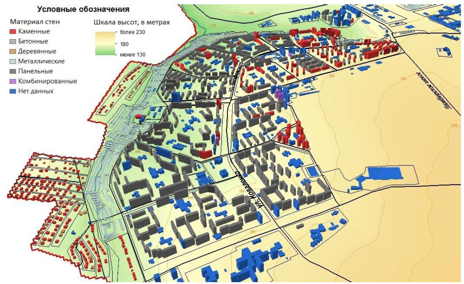 ArcScene позволяет создавать сцены с перспективными видами, где можно перемещать и взаимодействовать с данными геоинформационной системы. Можно представлять на поверхности растровые и векторные данные, а также вытягивать по высоте векторные объекты для придания им трехмерных свойств. Также возможно использование инструмента 3D Analyst в ArcScene для создания и анализа поверхностей. 3D Analyst позволяет осуществлять предварительный просмотр и навигацию по данным 3D. Есть возможность создавать слои данных ГИС и определять для них свойства трехмерного изображения [9]. Для создания 3D-модели городской застройки в атрибутивную таблицу данных слоя застройки была добавлена информация о высоте объектов. При создании сцены в качестве картографической растровой подложки послужила цифровая модель рельефа на исследуемую территорию, построенная в ГИС ArcGIS 10.0. После добавления в ArcScene, для придания поверхности выразительного и красочного вида, в свойствах слоя необходимо настроить цветовую палитру и базовые высоты. Для полноты изображения были добавлены слои дорог и кварталов. На 3D-визуализации цветом показаны материалы стен зданий. Также был осуществлен облет территории вдоль улиц Коваленко и Веселовского.