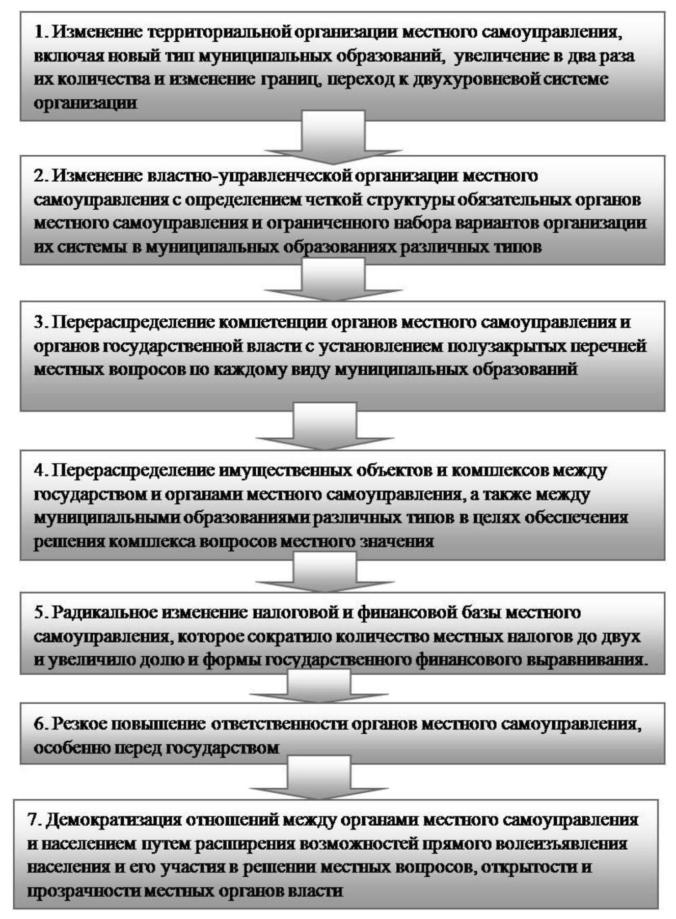 Начало муниципальной реформы связывают с принятием Федерального закона от 06.10.2003 г. № 131-Ф3 «Об общих принципах организации местного самоуправления в Российской Федерации» 2, пришедшим на смену Федеральному закону от 28.08.1995 г. № 154-Ф3 с аналогичным названием 3. Муниципальная реформа предполагала установление новых принципов территориальной организации местного самоуправления, изменение структуры органов местного самоуправления, выстраивание новых взаимоотношений последних с органами государственной власти федерального и регионального уровней.