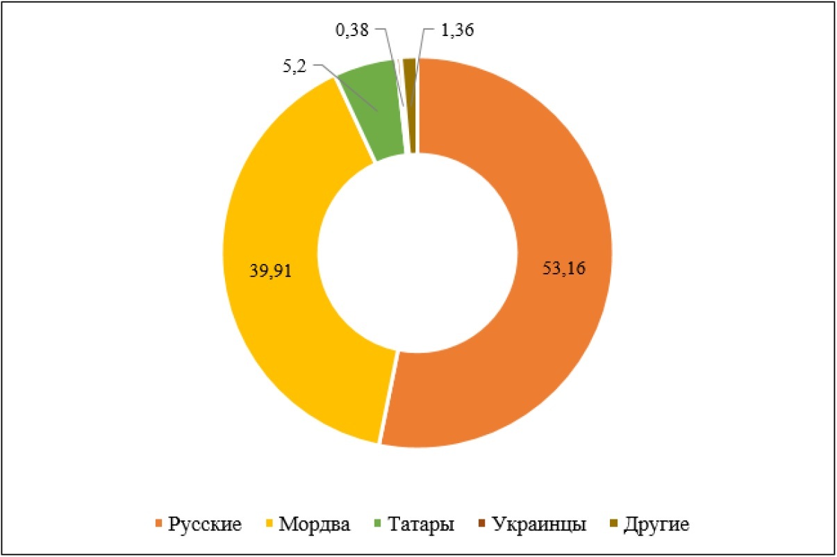 Республика Мордовия, по данным Всероссийской переписи населения 2010 г. [5; 7], отличается значительным преобладанием в национальном составе русских, их доля составляет 53,16% общей численности населения (см. рис. 1). Далее идут коренные жители республики – мордва (39,91%), а третье место в структуре национального состава региона занимают татары с процентным содержанием в общей численности в 5,20% (см. рис. 1).