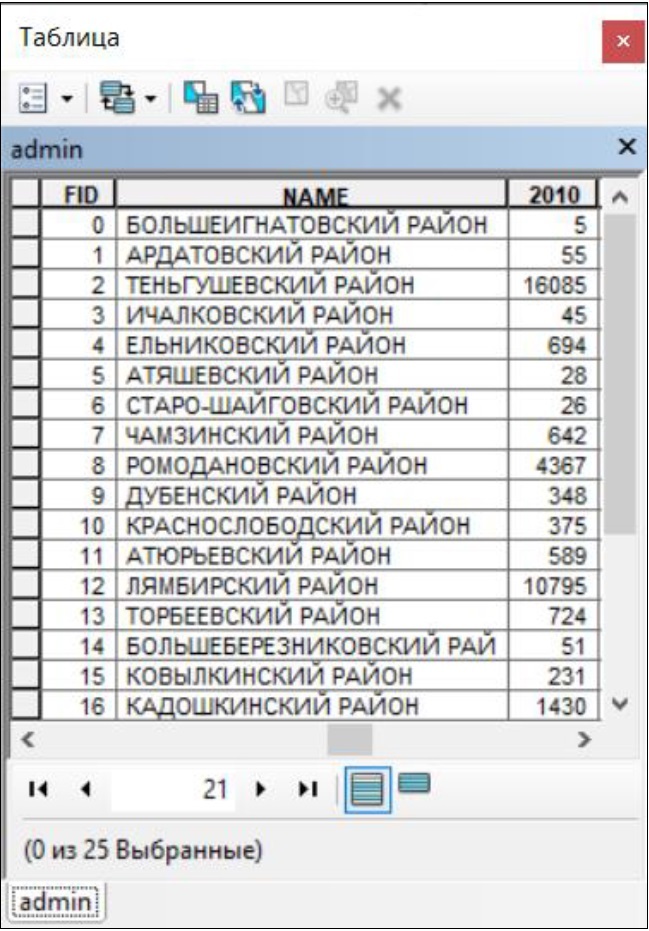 Рис. 3. Атрибутивная таблица с информацией о численности татарского населения в Республике Мордовия.