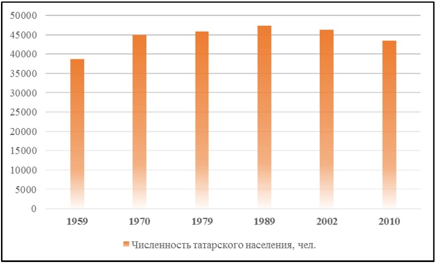 Рассмотрев и проанализировав полученные материалы, иллюстрирующие динамику изменения численности татарского населения, карту (см. рис. 4), таблицу (см. табл. 1) и диаграмму (см. рис. 5), – мы видим, что численность татар на территории Республики Мордовия в настоящее время имеет общую тенденцию к уменьшению. Если за 30-летний период с 1959 по 1989 гг. численность татар увеличилось на 8 692 чел., то за 21 год – с 1989 по 2010 гг., мы видим ее снижение на 3 936 чел.