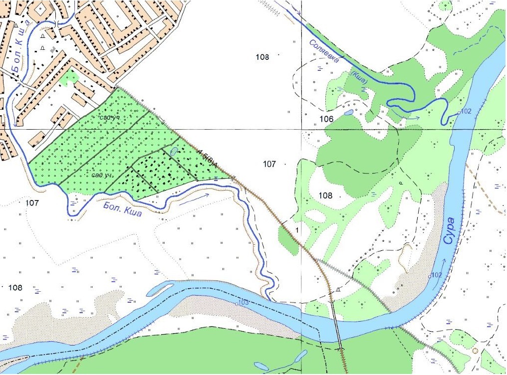 В справочнике ГИ указано, что р. Пичелейка впадает в Суру на расстоянии 442 км устья. Но в действительности Пичелейка — правый приток р. Большая Кша (рис. 4). При регулировании стока р. Большая Кша было сформировано ответвление, которое соединили с участком ее прежнего русла р. Кша (современное название р. Соляевка). На фрагменте современной карты, представленном на рис. 5, видно, что притоками Суры являются р. Большая Кша и р. Соляевка (Кша).