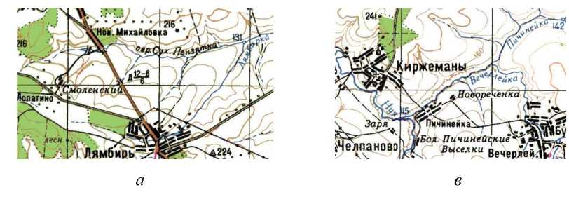 Также было выявлено, что у ряда малых рек, принимающих притоки, наименование общего потока сменилось на более употребляемое название. Например, в списке ГИ руч. Сухой Пензятка впадает в р. Инсар, его правым притоком является р. Лямбирка. На современной карте Лямбирка — левый приток р. Инсар (рис. 6а). В списке ГИ р. Пичинейка (Пичиней) — правый приток р. Нуя, принимает р. Вечерлейка (Вечерлей) по левому берегу. На рис. 6в дан фрагмент современной карты, где показано, что р. Вечерлейка стала притоком первого порядка р. Нуя.