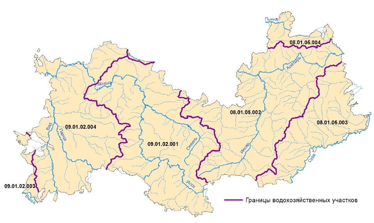 Территория Республики Мордовия входит в следующие гидрографические единицы: на бассейновом уровне — 08.01.00. Волга до Куйбышевского водохранилища (без бассейна Оки) и 09.01.00 Ока, на подбассейновом уровне — 08.01.05. Сура, 09.01.02. Мокша. Для построения бассейнов рек были применены методы цифрового моделирования рельефа [7]. С использованием ГИС-технологий на основе ЦМР на территории республики были выделены границы водохозяйственных участков: 08.01.05.002 (Алатырь от истока до устья), 08.01.05.003 (Сура от Сурского г/у до устья р. Алатырь), 08.01.05.004 (Сура от устья р. Алатырь до устья), 9.01.02.001 (Мокша от истока до в/п г. Темников), 09.01.02.003 (Цна от г. Тамбова до устья), 09.01.02.004 (Мокша от в/п г. Темников до устья без р. Цны). На рис. 7 представлена картографическое изображение рек и ручьев, указанных в справочнике ГИ, а также даны обозначения и границы водохозяйственных участков, расположенных на территории Республики Мордовия.