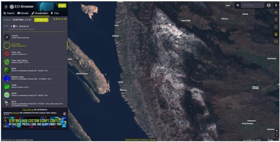 В поиске наиболее удобного и простого сервиса для получения спутниковых изображений был найден сервис EO Browser [10]. С помощью Sentinel Hub открытые спутниковые снимки доступны через два основных сервиса: EO Browser (https://apps.sentinel- hub.com/eo-browser) и Sentinel Playground (https://apps.sentinel-hub.com/sentinel-playground).