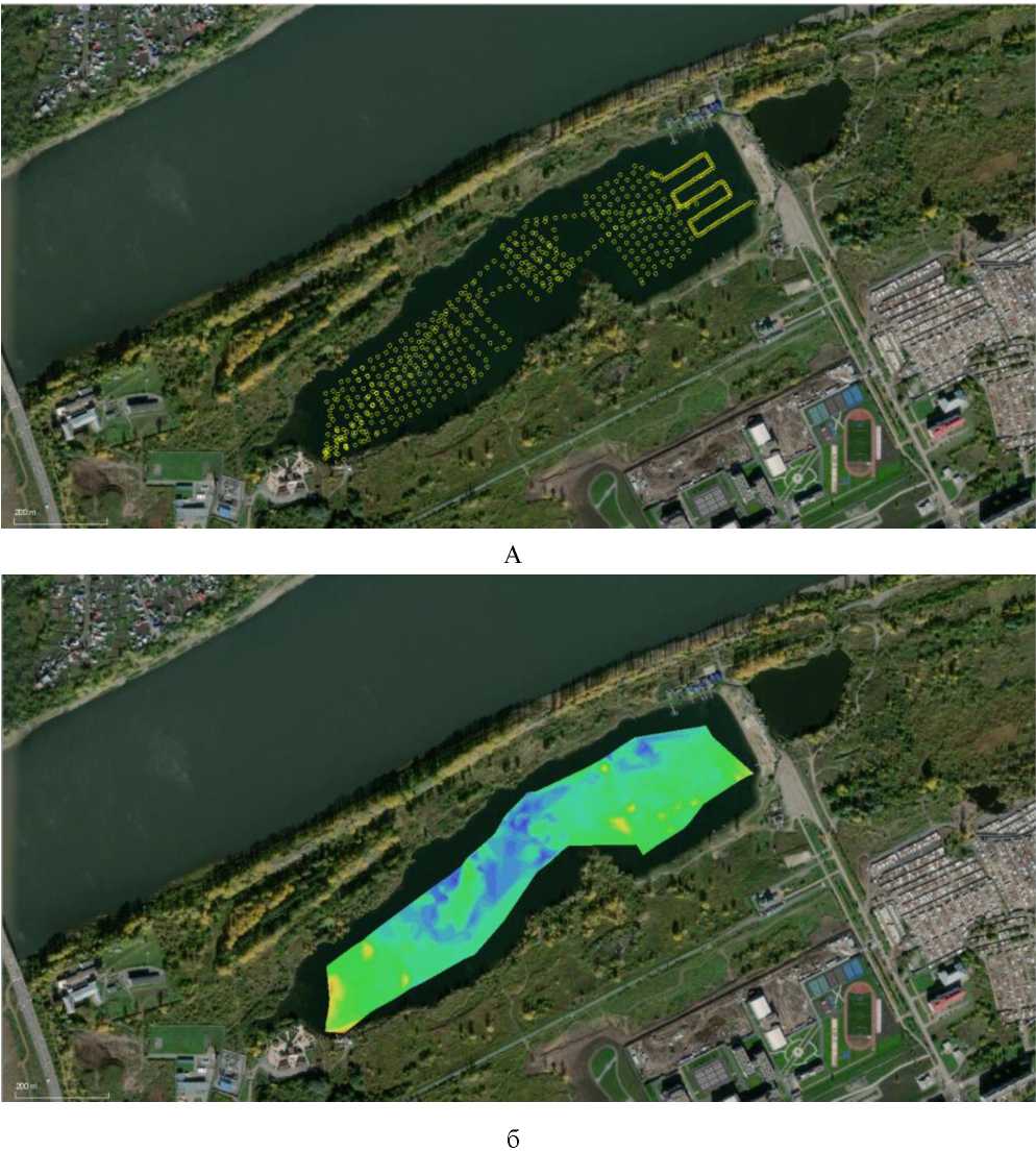 Рис. 2. Схема промеров глубин водоема (а) и полученный по их результатам профиль дна (б) [1].