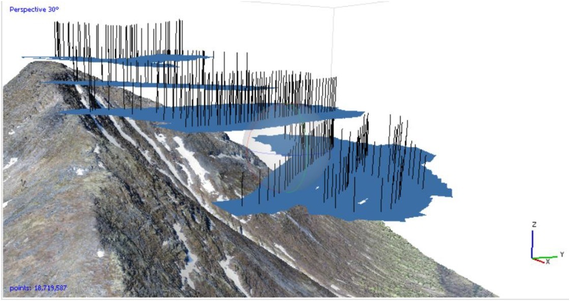 Для решения этих проблем была разработана методика выполнения аэрофотосъемки, которая заключалась в проведении залётов БПЛА на разных высотных эшелонах для «ступенчатой» съемки склона цирка (см. рис. 1), а также в дополнении съемки в надир перспективными кадрами крутых склонов.