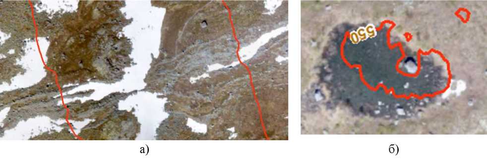Для ледникового цирка выявлены следующие сложности: отсутствие прорисовки долин малых водотоков, несогласование рисунка горизонталей по днищу большого водотока (см. рис. 3а); прорисовка горизонталей на месте водных объектов площадной локализации горных озер и скал-останцев (см. рис. 3б); отсутствие разрывных форм рельефа; крутые склоны, которые должны наноситься специальными условными знаками прорисовывались системой горизонталей с явным растяжением отстояния их друг от друга.