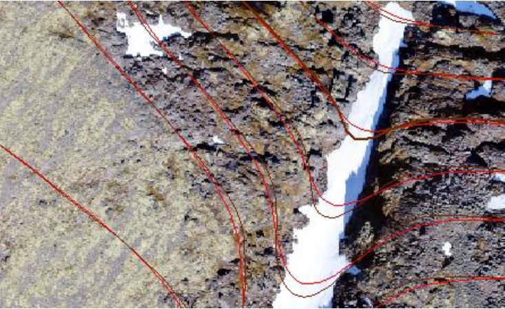 Рис. 4. Красным цветом показаны первые построенные горизонтали (исходная фильтрованная ЦММ), коричневым — новые построенные горизонтали (построенная по горизонталям ЦММ и сети водотоков ЦМР).