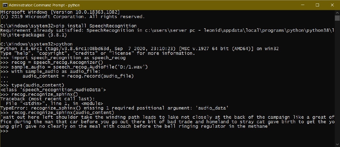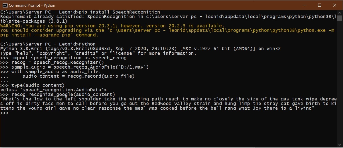 - Установка библиотеки SpeechRecognition в командной строке компьютера.