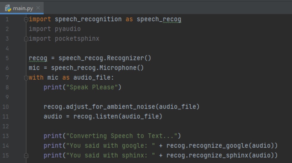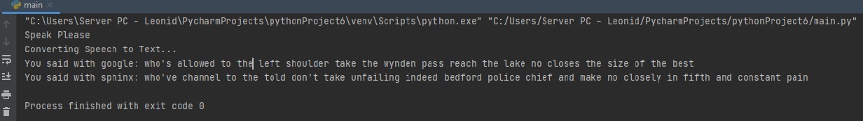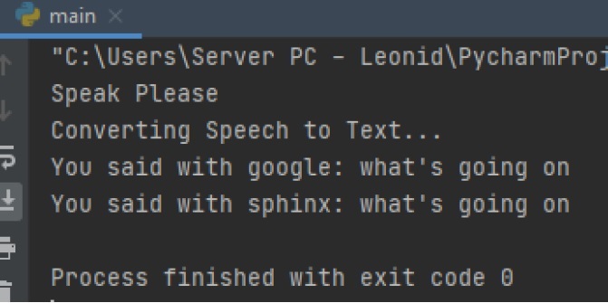Далее было проведено тестирование систем, которое осуществлялось с применением языка python и выбранных ранее в обзоре систем: PocketSphinx API и Google Speech API и библиотек SpeechRecognition и Pyaudio.